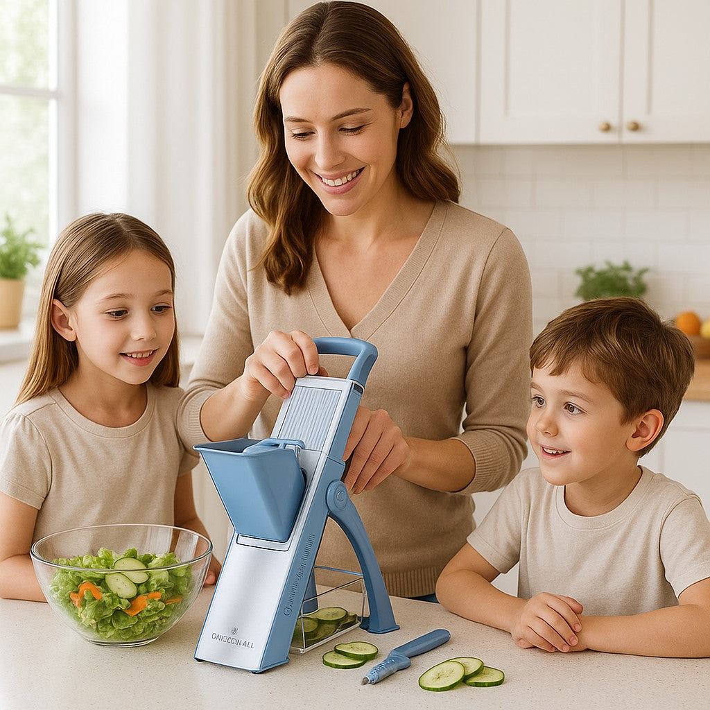 5 minutes suffisent pour trancher tous vos légumes, avec précision en un clin d'œil avec notre mandoline multifonction.
